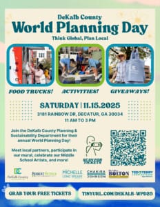The DeKalb County Department of Planning and Sustainability will host the annual World Planning Day event at the Rainbow Park Amphitheatre. The event focuses on bringing the community together to learn about planning and take-home information and resources that will help them best advocate for their communities. The event also aims to be family-friendly and accessible to all ages! Over twenty DeKalb County Departments and local partners will participate in the event to share valuable information and resources with the community. Partners include MARTA, the Center for Hard to Recycle Materials (CHaRM), DeKalb Board of Education, the UGA Cooperative Extension, and the DeKalb County Board of Commissioners. The event will also highlight the winners of the World Planning Day Middle School Art Contest.